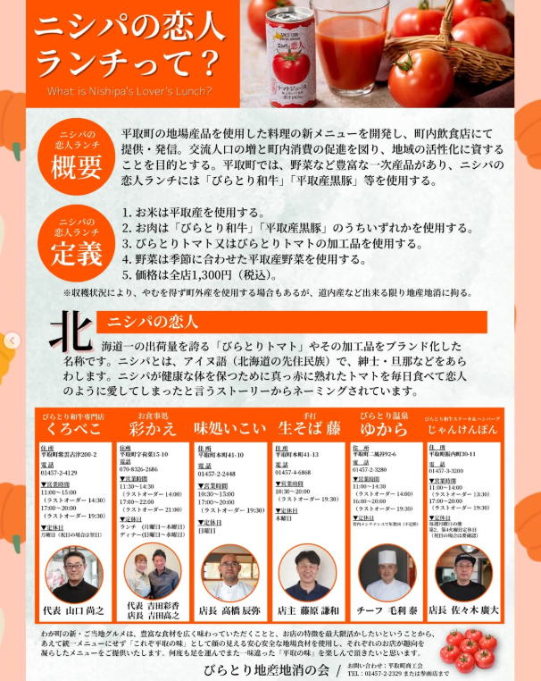 「ニシパの恋人ランチ」は平取町産のお米やお肉などを使用し、地域の活性化に資することを目的として、夏と冬の時期にそれぞれ実施されています。
