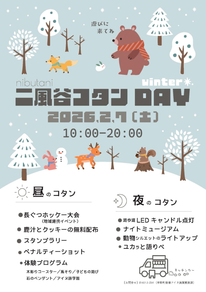 当日は、二風谷アイヌ文化博物館の無料開放、昔の遊び体験、木彫体験や馬そり体験、アイヌ語のワークショップなど、普段味わうことのできない特別な体験プログラムに加え、夜の幻想的なコタンの風景を楽しむことができます。