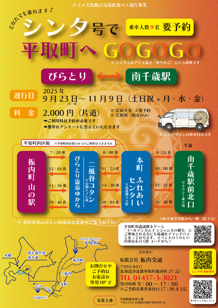 9/23(火祝)~11/9(日)まで運行!平取町と南千歳駅を結ぶ「シンタ号」のご案内