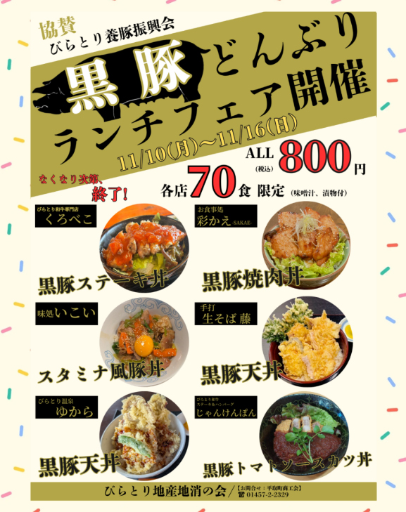 「びらとり地産地消の会」主催の「黒豚どんぶりランチフェア」が開催されます。「びらとり和牛」とともに平取町の特産品の「びらとり黒豚」を、ぜひこの機会に味わっていただきたいです。